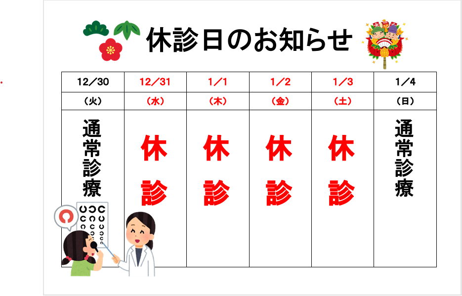 また、年末年始は、コンタクトレンズの各メーカーさんの休業により、コンタクトレンズ注文時の納期が長くかかることがあります。